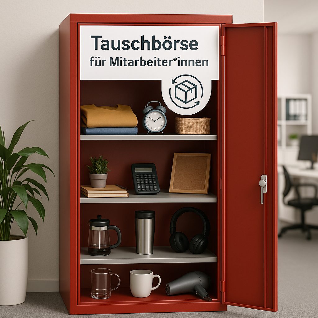 Mitarbeitende und Bewohner können im Schrank Dinge, die sie nicht mehr nutzen, unkompliziert einstellen und anderen zur Weiterverwendung anbieten – zum Beispiel kleinere Arbeitsmaterialien, Zubehör oder private Alltagsgegenstände, die noch in gutem Zustand sind. Damit die Abgabe und Abholung geordnet, sicher und zentral erfolgen kann, soll ein feuerfester Schrank als fester Aufbewahrungsort dienen. In diesem Schrank werden die Tauschartikel zwischengelagert, bis sie von jemand anderem mitgenommen werden, wodurch Unordnung in Büros und Fluren vermieden und gleichzeitig ein sicherer, klar definierter Platz geschaffen wird. So werden Ressourcen geschont, Abfall reduziert und der Austausch unter Kolleginnen und Kollegen auf einfache Weise gefördert.