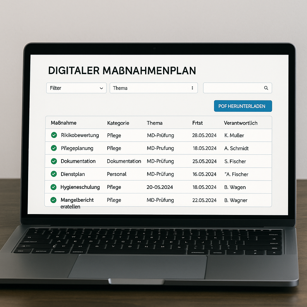 In meinen Einrichtungen gibt es eine Vielzahl an einzelnen Maßnahmenplänen, je Prüfung, Thema, Auffälligkeit usw. Den Überblick zu behalten ist nicht so einfach, da in einem Maßnahmenplan verschieden viele Maßnahmen stehen, die teilweise mit unterschiedlichen Fristen hinterlegt sind. Es kommt häufig vor, dass nur einzelne Maßnahmen in einem langen Maßnahmenplan in der Bearbeitung fehlen, sodass man sich dann Wochen später durch die Maßnahmenpläne klick, um diese abzuhaken. Viel übersichtlicher wäre ein Programm in dem man einzelne Maßnahmen einträgt, diese einer Kategorie (z. B. Pflege) und einem Thema (z. B. MD Prüfung) zuordnet, eine Frist und verantwortliche Personen hinterlegt und das Programm automatisch Erinnerungsbenachrichtigungen an die zuständigen Personen versendet, um die Einhaltung der Frist zu garantieren. In dem Programm sollte man nach Kategorie und Thema filtern können, um sich eine Übersicht über die Maßnahmen die bspw. nur für MD Prüfung hinterlegt wurden auflisten zu lassen. Diesen "Maßnahmenplan" sollte man dann zusätzlich als PDF-Datei herunterladen können, da manche Prüfinstanzen diesen in bestimmten Fällen zugesendet bekommen. Zusätzlich sollte man einzelne Maßnahmen verschiedenen Kategorien und Themen zuordnen können, sodass diese einzelnen Maßnahmen in verschiedenen Maßnahmenplänen gleichzeitig als erledigt vermerkt werden können. Für die bessere visuelle Vorstellung, man legt eine To Do Liste an, und bei Erledigung der Aufgabe wird diese nach Kategorie und Thema archiviert.