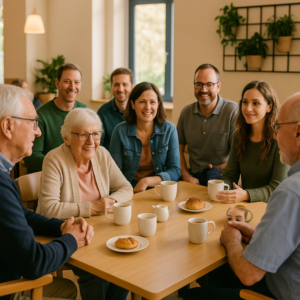 Einmal wöchentlich findet in der Cafeteria ein offenes Austausch-Café für Ehrenamtliche, Besucher, Bewohner*innen und Mitarbeitende statt. Bewohner*innen und Mitarbeitende genau, wann sie vorbeikommen können, und es entsteht eine feste Routine für Begegnung, Austausch und kurze Wunschabfragen. Gerade diese Regelmäßigkeit senkt die Hemmschwelle, fördert Kontinuität in den Gesprächen und macht es leichter, Anliegen nachzuverfolgen und gemeinsam weiterzuentwickeln. Die festen Wochen-Termine können jeweils ein klares, aber unkompliziertes Gerüst haben, etwa mit einer offenen Ankommensphase, einer kurzen Runde für aktuelle Wünsche oder Themen und anschließend Zeit zum freien Gespräch und Kontakteknüpfen. Ergänzend kann kontinuierlich abgefragt werden, welche Angebote Angehörige einbringen möchten, sodass aus den Rückmeldungen nach und nach ein „Mitmach-Pool“ entsteht. Aus wiederkehrenden Fragen und Interessen können zudem gezielt Infoabende abgeleitet werden, die planbar angekündigt und inhaltlich an den Bedürfnissen der Beteiligten ausgerichtet sind. So wird aus dem wöchentlichen Café ein stabiler Kommunikations- und Beteiligungskanal, der Gemeinschaft stärkt und gleichzeitig konkrete Verbesserungen im Alltag ermöglicht.