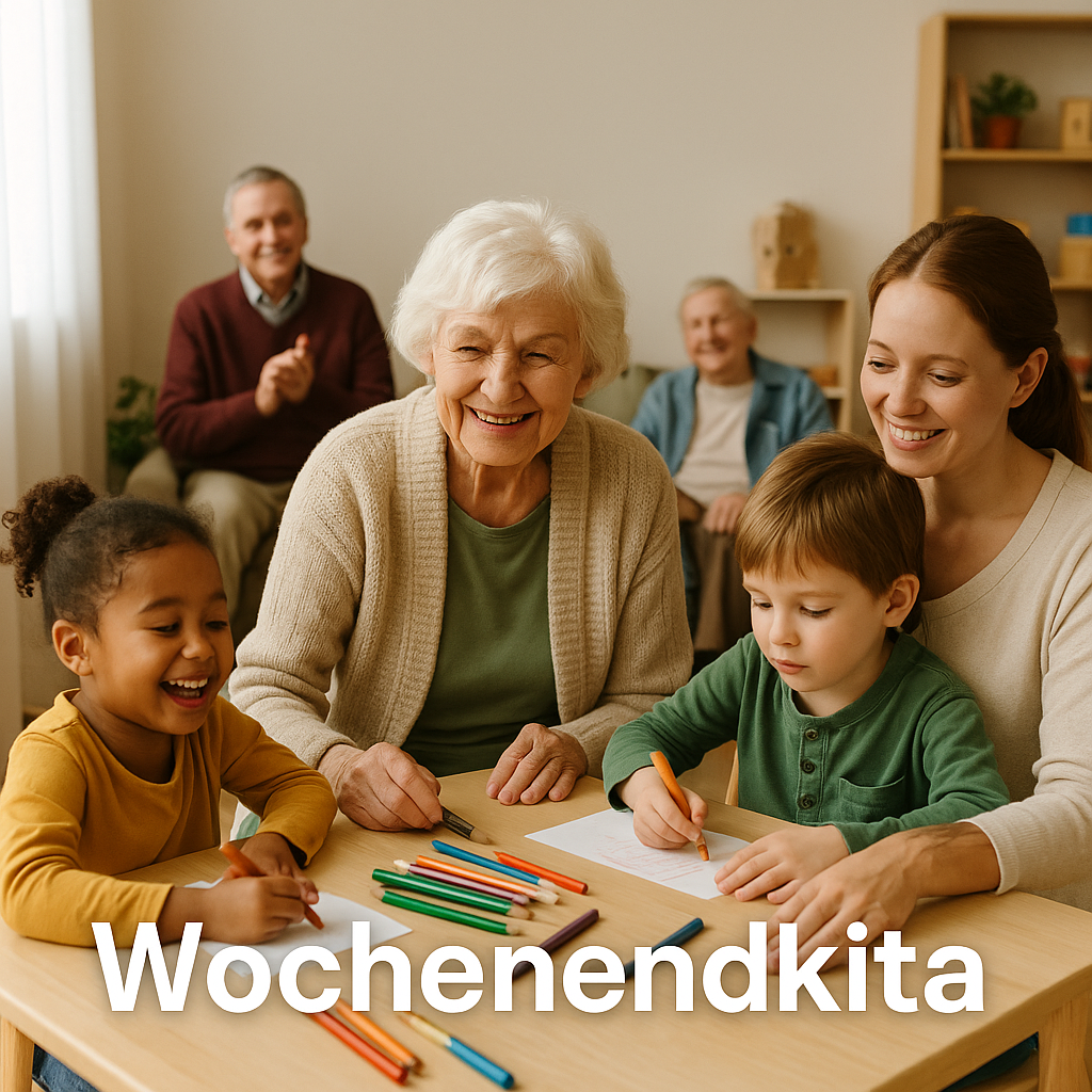 Hauseigene Kita fürs Wochenende für alleinerziehende Eltern (Mitarbeiter*innen). Gemeinsam mit Bewohner*innen und ABs zusammentreffen von Jung und Alt. Das ist auch ein Beitrag zur Nachhaltigkeit, da die Mitarbeitenden keine zusätzlichen Fahrten haben.