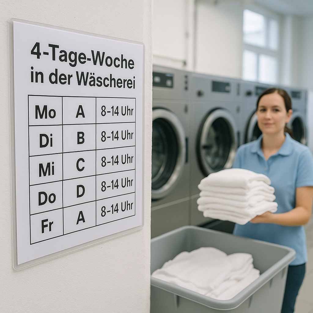 Die Wäscherei stand vor neuen Herausforderungen. Die Laufzeiten der Maschinen sollten verlängert werden. Aus der 5 Tage Woche der Kolleginnen wurde eine 4 Tage Woche der Kolleginnen in einer 5 Tage Woche der Wäscherei.
