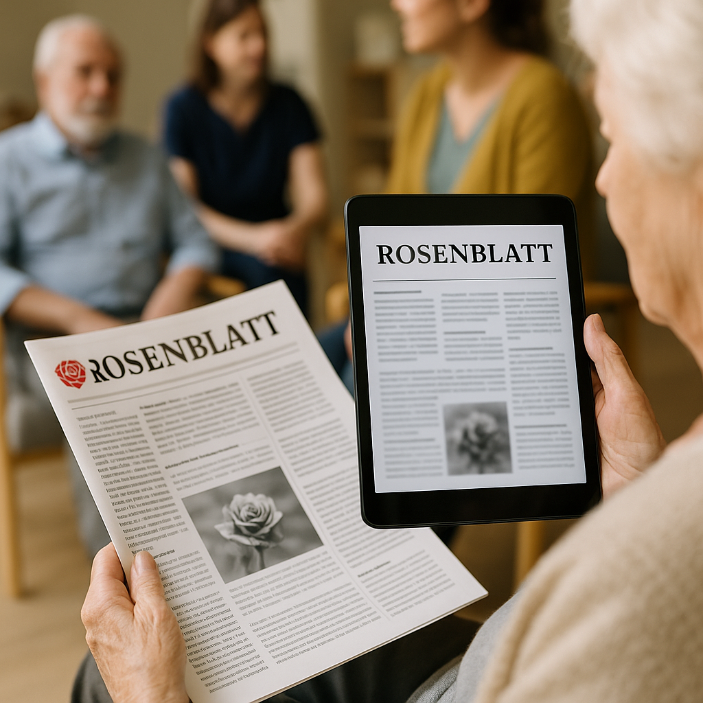 Die Digitalisierung der hauseigenen Zeitung (Rosenblatt) als zeitgemäße Weiterentwicklung, die Information, Teilhabe und Alltagspraxis im Haus deutlich verbessert. Statt die Zeitung ausschließlich gedruckt auszulegen, wird sie zusätzlich auf Tablets verfügbar gemacht, sodass Bewohner*innen, Angehörige und Mitarbeitende flexibel darauf zugreifen können. Inhalte können damit leichter geteilt, schneller aktualisiert und auch Menschen zugänglich gemacht werden, die Schwierigkeiten mit kleinen Schriften oder dem Handling von Papier haben.