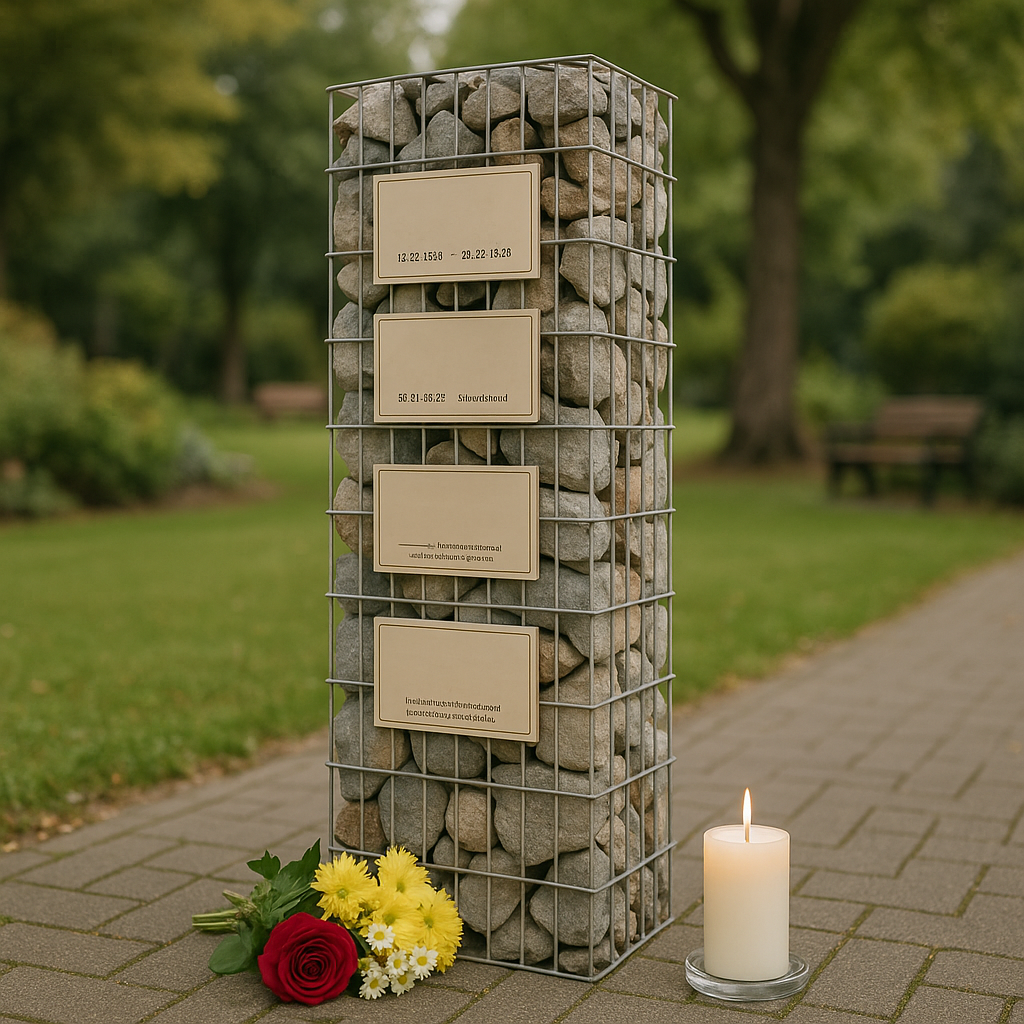 Da mir manchmal ein Ort fehlt, an dem man den verstorbenen Bewohner*innen oder Mitarbeiter*innen gedenken kann, kam mir die Idee, eine Gabionenwand oder Gabionensäule zu errichten, auf der der Name, Geburtsdatum und Strebedatum der verblichen Person steht, vielleicht noch 1, 2 Sätze zu der verstorbenen Person, natürlich nur für die Leute, die das auch möchten.