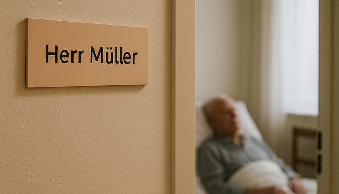 Farblich hinterlegte Namensschilder an den Zimmertüren der Bew. in der Sterbephase.